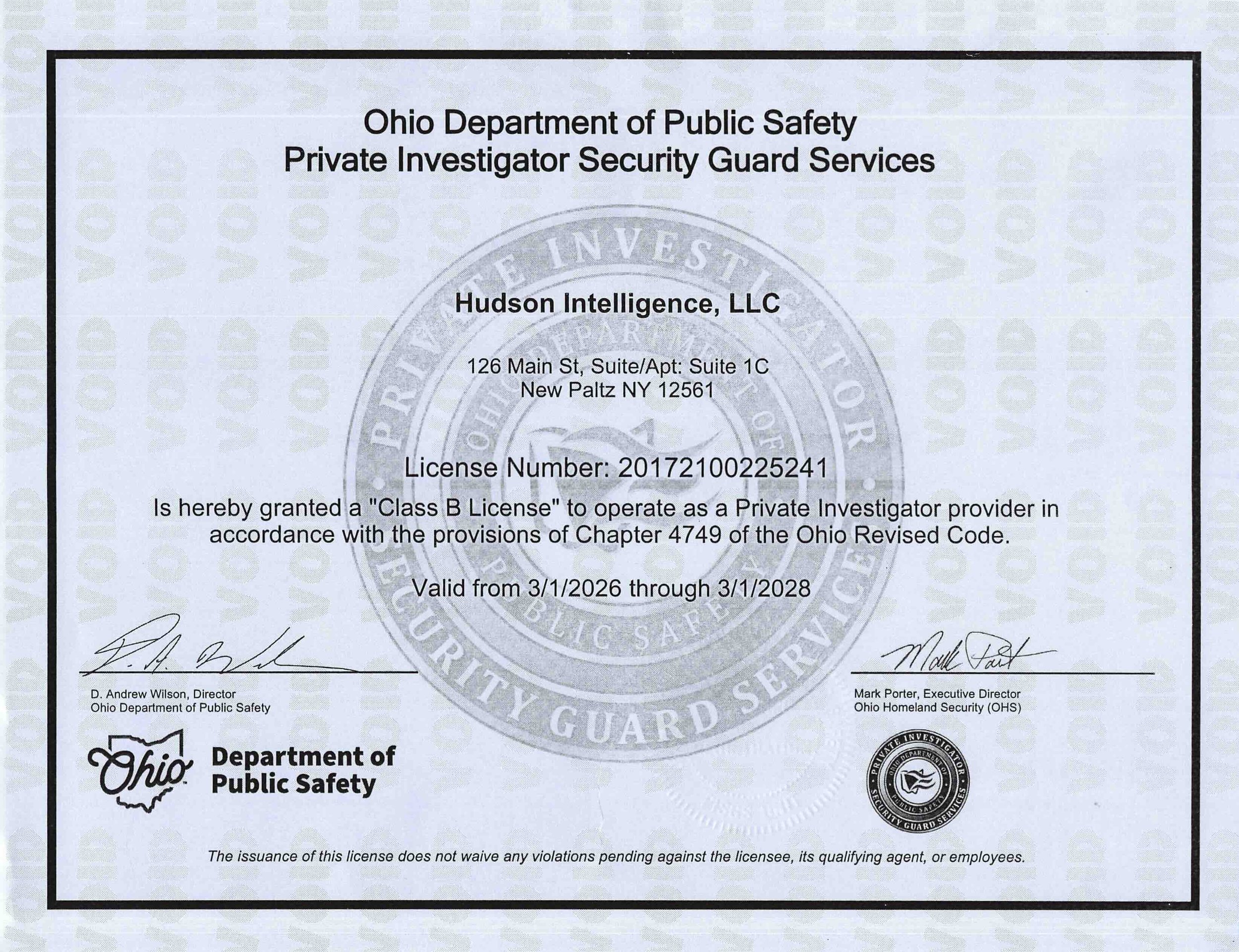 Hudson Intelligence - Ohio Private Investigator Agency License